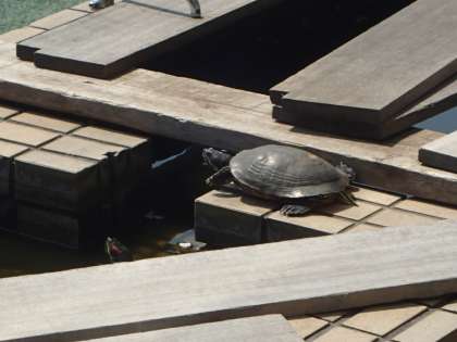 八幡小の一年生の教室の前には小さな池があります。そこには金魚と亀がいます。外来種の緑亀です。とても大きくなり、食欲も旺盛。日本の自然界に急速に広がり、被害を与えています。ただ、本校の亀たちはえさをもっていくとしっかり顔を出して寄ってきます。どうも顔か声を覚えているようです。