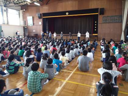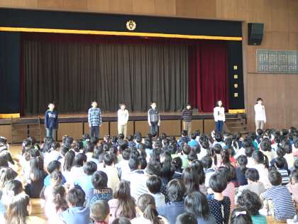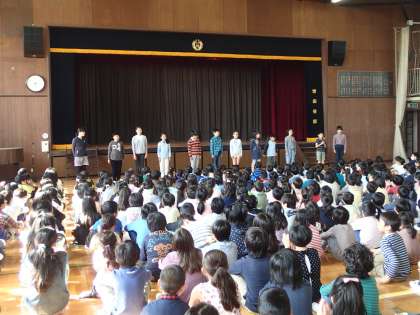 木曜日に「委員長紹介集会」が行われました。代表委員会の各クラスの代表、各委員会の委員長がそれぞれあいさつの言葉をしっかり表明することができました。どのメンバーもきちんと暗唱していて、態度も立派でした。また、聞く方もしっかり聞くことができました。