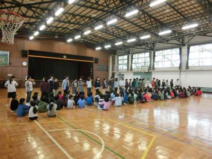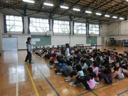 写真上:5・6年生が体育館に集合しました。