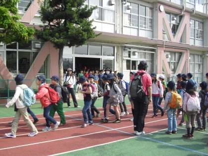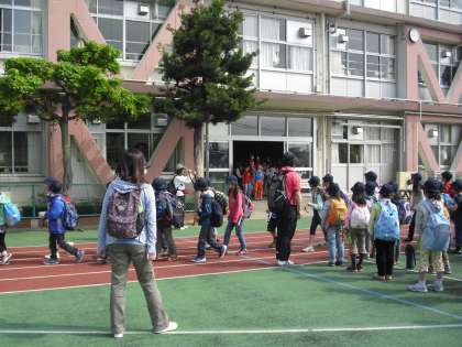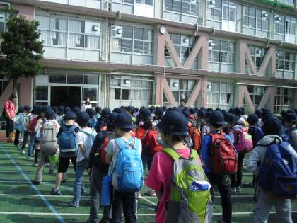 天候に恵まれ横浜つくし野フィールドアスレチックにでかけました。校帽をかぶり元気に出発しました。1年生も見送ってくれました。