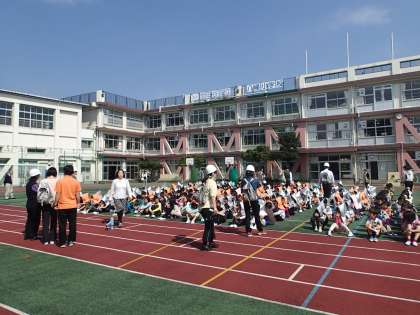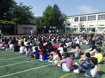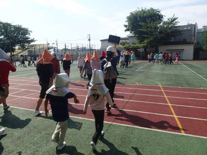 今日は火事を想定しての避難訓練。ほとんどの児童がハンカチで口を押さえて避難してきました。どんなときにも使えるよう、これからもハンカチは身につけているようにしましょう。避難の仕方は上手にできました。
