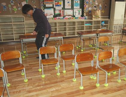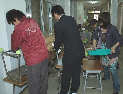 平成20年度になり、新しく異動してきた職員をむかえ4月1日から、会議や準備を精力的に進め、新学期に備えています。写真は新1年生の教室で、机・椅子の脚に教員総出でテニスボールを装着しているところです。(このテニスボールは、床面保護と騒音防止を目的として装着するもので、3月に保護者の皆さんからボランティアを募りカッターで切り込み作業をしたものです。)