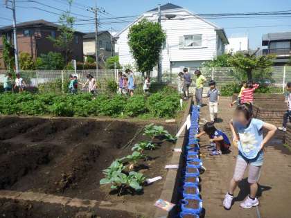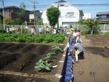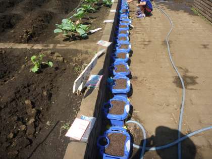 2年生はトマトの種を植えました。大きく育つといいですね。その後は、先日植えたトウモロコシや野菜の水やりをしていました。順調に育っています。