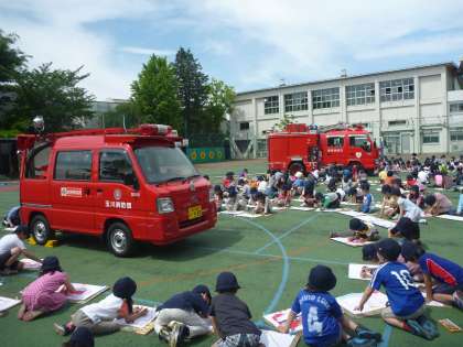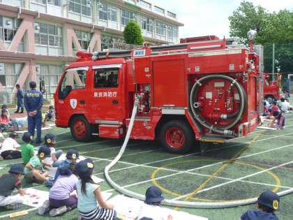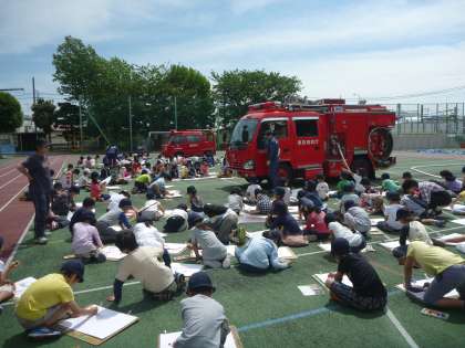 今日は1年、2年、3年の消防写生会でした。奥沢消防署と地元の消防団の方々が2台の消防車と共にやってきました。子どもたちは大喜び。画用紙いっぱいに大きな消防車を描いていました。