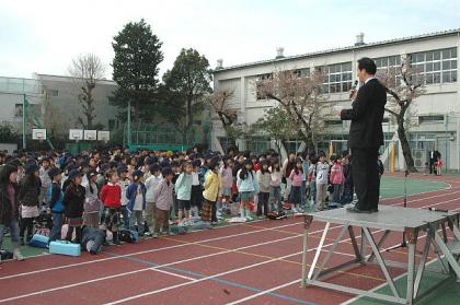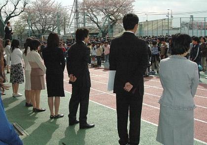 今日7日(月)は、平成20年度1学期の始業式。学校の教育活動が実質的にスタートしました。教員教員18名中5名が新たな顔ぶれで、すでに1日の日からフル回転という状態でしたから、職員の勤務としては先週までの延長上なのですが、やはり初めて学級の子どもたちと出会う担任もいるわけで、職員室には緊張感が漂っていました。それは子どもたちも同じで、登校してくる子どもたちも期待と不安の入り混じった表情をしていました。心配されていた天候は、朝のうち日の光が時折さすほどで、予定通り校庭で始業式を行いました。はじめは校長より年度始めの言葉、続いて6年代表2名がこの1年の抱負を述べました。その後、転出・転入職員の紹介、そして子どもたちが待っていた担任発表、全員の校歌斉唱で始業式が終了しました。