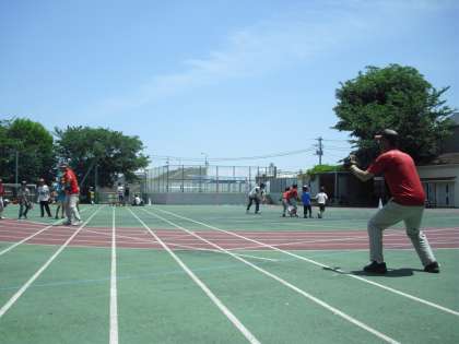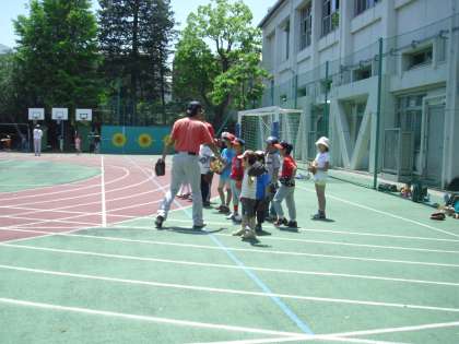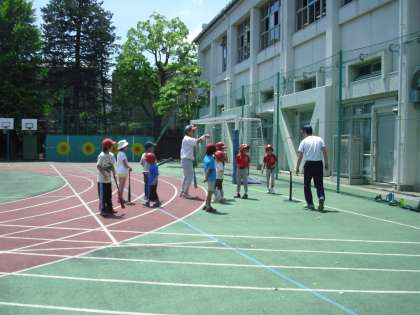 世田谷区教育委員会生涯学習・地域・連携事業の遊び場開放の活動です。校庭での練習が始まりました。初夏の日差しも強く水分補給をしながら、進めています。