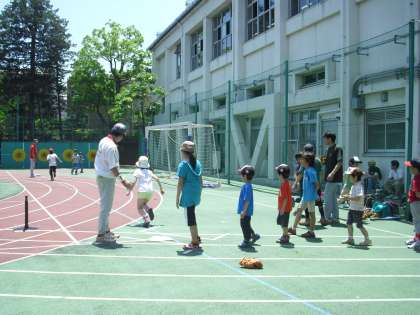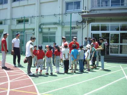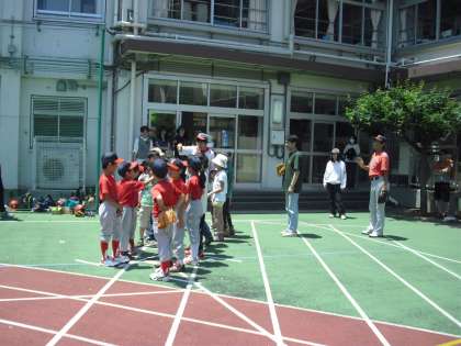 いよいよ試合が始まります。ベースランニングの練習をしてから、校長による始球式があり、試合がはじまりました。1回終了どちらも得点でき、盛り上がっています。