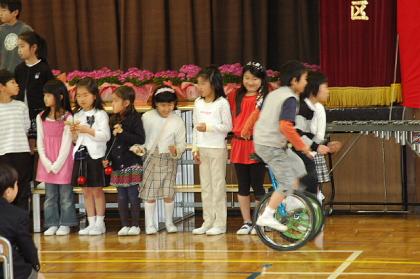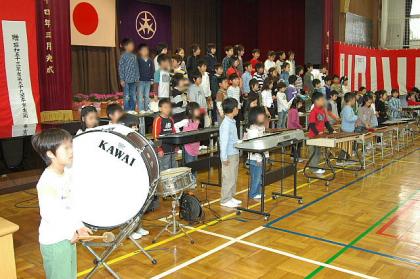 入学式は校歌斉唱の後、閉式の言葉で閉じ、続いて2年生による歓迎の出し物です。ステージ前に2年生が入場し、学校の様子を実演を交えて呼びかけで発表しました。実演は縄跳び、ボール投げ、一輪車など、学校の1年先輩として成長した姿をたっぷりと見せてくれました。最後は歌と合奏で、合奏は変調、リズムの変化がある難しい「キラキラ星変奏曲」を披露。一生懸命な演奏に会場の来賓・ご家族の皆様から大きな拍手をいただき、2年生も満足そうでした。よき伝統の継承として、新入生の子どもたちも来年はがんばってくれることでしょう。