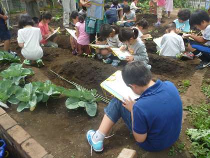 今日は3年生が理科の観察で八幡ファームに行きました。芽が出てきたホウセンカ、ヒマワリの様子を絵と言葉で観察カードにまとめました。少しずつ、その変化を見ていきます。みんな、成長していくのを楽しみにしています。