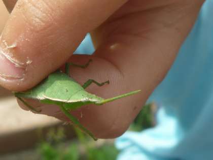 観察し終わった子たちは、八幡ファームの生き物探し。ショウリョウバッタを早速見つけていました。