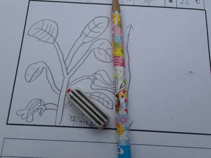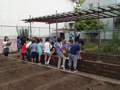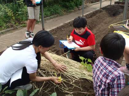 一昨日、4年生は植物の観察と水やりをしていました。観察カードに書き込み、次第に育っていく様子に気がつくことができました。また、ワラをしいて、メロンなどが病気にならないよう作業をしていました。