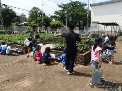 双葉から本葉が出ようとしているトマト、2年生が観察しました。水やりや草取りも自分たちでしっかりしています。間引きもしていました。大きく育つといいですね。
