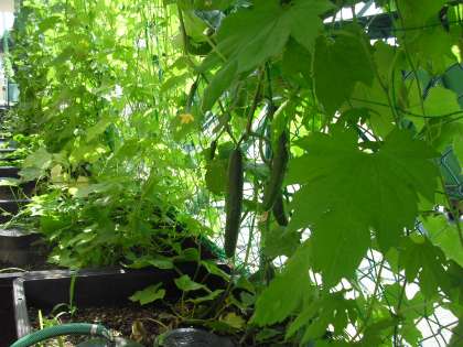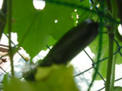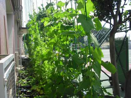 緑のカーテンが強い日差しを受けてぐんぐん生長しています。現在は、きゅうりが毎日収穫できます。新鮮なきゅうりには、とげがあり注意して扱わなければ痛いとげにあいます。これから追肥をしていきます。