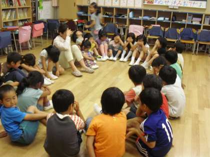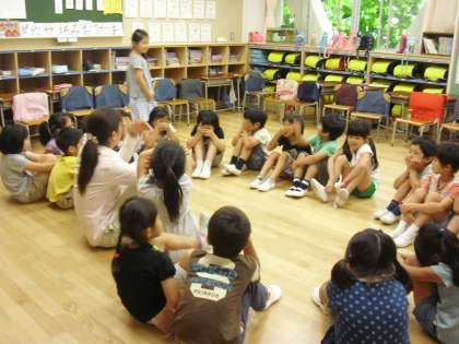 特色のある教育活動の一環で1年2年の英語活動がありました。講師の先生が英語で説明し、ハローソングやABCの歌や天気の言い方を学習しました。最後にハンカチ落としを英語の説明で安全に気を付け楽しんでいました。