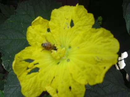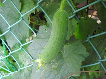 緑のカーテンは、1階から2階に向かって生長しています。へちまの黄色い花も沢山咲き、はちが蜜をすいに来ています。へちまの実も付き始め、大きい物は、30センチぐらいあります。