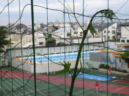 写真上:野球の練習を頑張る子どもたち(元気のいい声が3階まで届いていました)