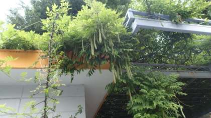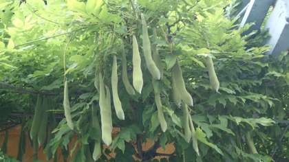 今年はたくさんの藤の実がなりました。花も綺麗に咲いたので、たくさんの蜂たちがその蜜を食べにやってきました。その結果、立派な実ができました。まだ周りは堅くて中を見ることはできませんが、どんな種ができているか楽しみですね。