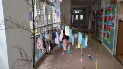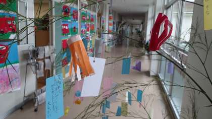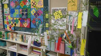 例年おこなっている七夕のかざり。1,2年や帰国外国人教室の児童も綺麗に飾りを作りました。またかわいらしい願い事を書いていました。かなうといいですね。