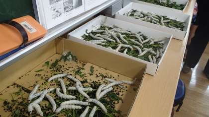 3年生の教室では、カイコを飼っています。学校の桑の葉も背の届くところは取り尽くし、他の学校や、保護者からももらいながら育てました。