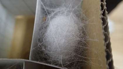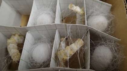 いよいよ繭を作る時期に入り、それぞれ決められた枠の中で糸を吐き出し始めました。白く輝く糸、絹は次第に楕円形の繭になっていきます。ここでカイコの役割は終わります。次は糸を取り出す段階に入ります。
