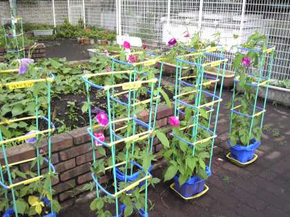 一年生の朝顔は毎日子どもたちが水やりをしています。綺麗に花が咲き始めました。夏休みは家で世話をします。九月にまた学校に持ってきます。