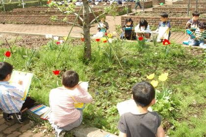 今日は一年生がその花を写生していました。「どの花を描いたらいいのか困っちゃう。だって、どれもきれいなんだもの。」と言って、学級園の中を探し回っていました。