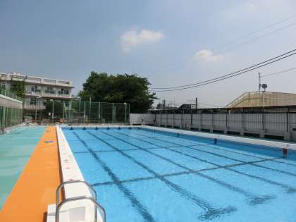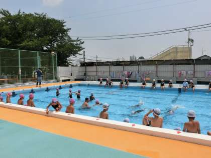 八幡小のプールではたくさんの子どもたちが泳いでいます。