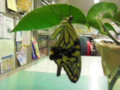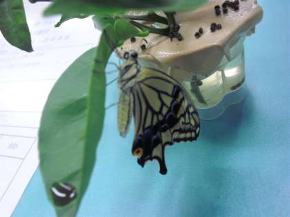 3年生は蚕とアゲハ蝶の成長を観察していました。今朝アゲハ蝶のさなぎが羽化しました。とてもきれいな羽を広げることができ、水泳指導に参加した児童は、見ることができました。