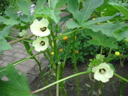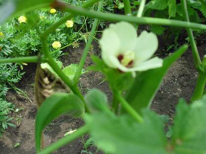 八幡ファームの1年生のオクラがきれいなかわいらしい花を咲かせています。実も付いて今が盛りです。