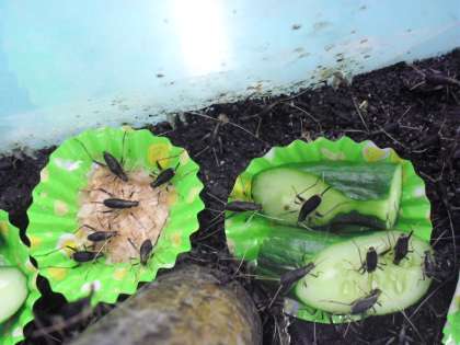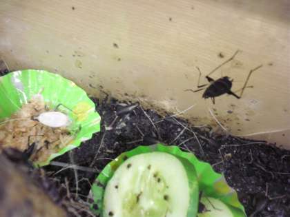 鈴虫が成虫に成長し、頼りない鳴き方ですが羽をこすり「りーんリーン」と鳴き始めました。羽化したばかりの白い羽のオスを発見しました。また、鰹節を与えると群がり黙々と食べていました。脱皮した抜け殻もあります。