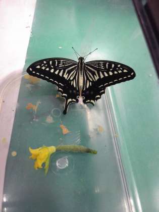 サナギだった三匹めが羽化しました。ぱたぱたと羽を動かしていたので気付きました。写真を撮ってから外へ離そうとすると激しく羽ばたくので時間がかかりました。蓋を開けると元気に飛び立ちました。