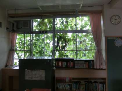 【写真上】教室の窓を覆う緑のカーテン