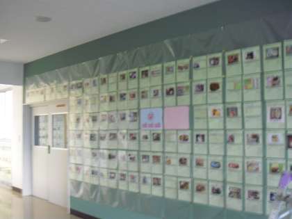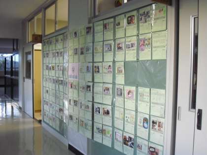 2階パソコン室前から体育館に向かって、夏休みに挑戦した「お弁当できたよ」カードが展示されています。PTAの担当の方々が連日作業し、掲示してくださいました。是非ご覧ください。
