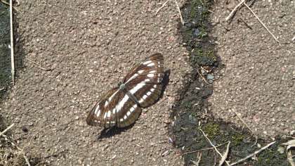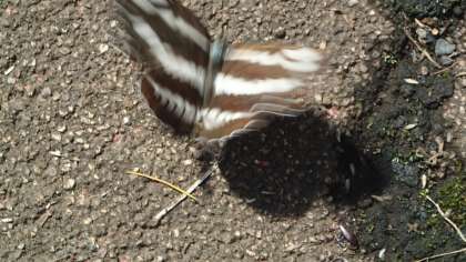 この写真のミスジチョウはタテハチョウの仲間で、模様が三本あるところから名前がついています。ホンミスジと似ていますが、一番前の筋が不連続ではないので、ミスジチョウだと判断できます。