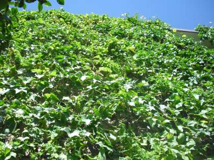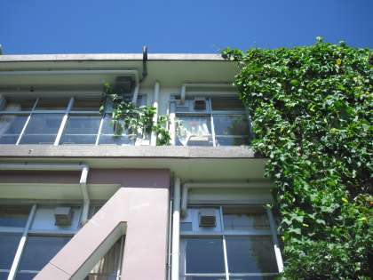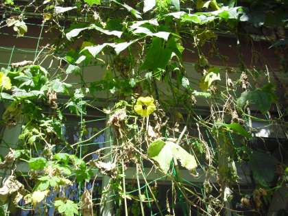 夏の様な日差しの日曜日ですが、校舎に架かる緑のカーテンは現在も元気に生長しています。蜂や蝶、トンボも寄ってきます。