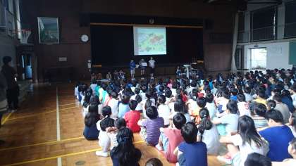 朝会で、代表委員会がユニセフへの募金を呼びかけました。スライドを使いながら、自分たちの思いを込めながら全校児童に語りかけていました。