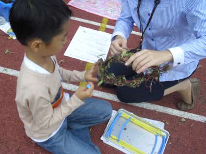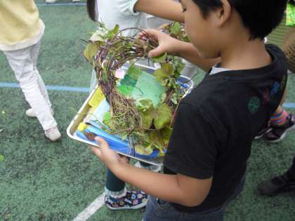 大切に育てていたアサガオの種取りも終わり、今日は、公開期間で参観されているお家の方と一緒にリース作りをしていました。針金を中にまきこみしっかりしたリースができました。この後飾りを付けていくそうです。