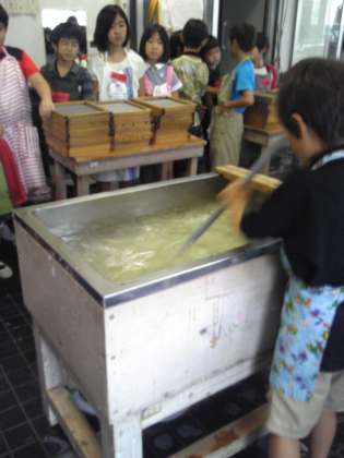 お弁当を食べた後は流しずきです。こうぞとトロロアオイをよく混ぜます。順番に全員体験しました。
