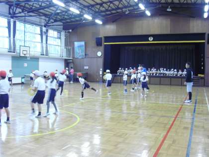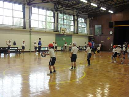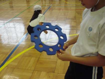 3年生の体育の時間に、リングビー協会の方たちの指導で、「リングビー」を体験しました。フライイングディスクの様に投げて楽しむ道具です。柔らかいので安全!