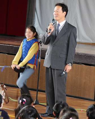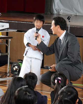 続いて空手東京大会、低学年優勝のY君。道着に着替えて登場し、りりしい姿の写真を紹介しました。ちょっと緊張してしまい、みんなの前で形を披露してもらえなかったのが残念でしたが、優勝の賞状を読み上げたところ、みんなから大きな拍手をもらいました。最後は乗馬を習っているNさん。乗馬のようすを撮影したビデオを映して、乗馬に使う道具を紹介してもらいました。これからも学校以外で様々なことで活躍している子を紹介したいと思っています。