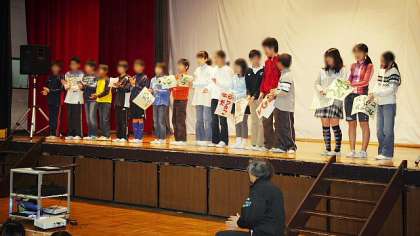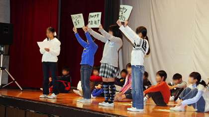 12月8日(火)、朝の集会は「給食委員会」の発表を行いました。給食委員会は給食の献立掲示をしたり、昼の放送で給食献立の紹介をしています。今日は、仕事の紹介と給食に関するクイズを出してくれました。