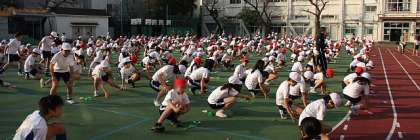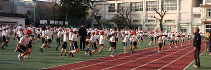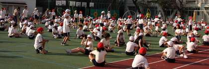 10日(木)の体育朝会はなわとびをしました。朝早くから体育着に着替えて集合した子どもたち。気温はちょっと肌寒いくらいで風もなく、降り注ぐ朝の日差しをあびて半袖半ズボンの体育着で元気にがんばりました。最初に準備運動を行い、いよいよなわとび。前跳びで跳び続け、ひっかかったら座るというルールで2ラウンド行いました。結果はさすがの6年生がたくさん残り、大きな拍手をもらっていました。