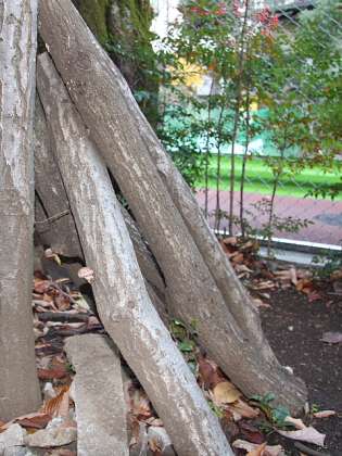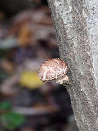 写真は、本校通用門のよこにある池の畔に立てかけてあるシイタケのコマを打ち込んだナラの木の丸太です。そこに、今朝シイタケを発見。・・・当たり前じゃないかと言われそうですが、2年間待ってやっと生えてきたシイタケです。
