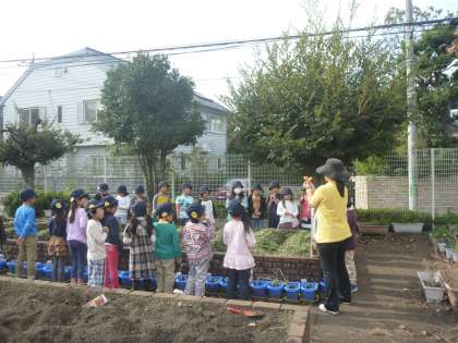 1年生の生活科の授業で、紅葉した葉っぱや秋の生き物探しを八幡ファームで行いました。桜を中心に黄色や赤の葉をたくさん集めていました。また、ツマグロヨコバイやカメムシ、シジミチョウなどを見つけることができました。
