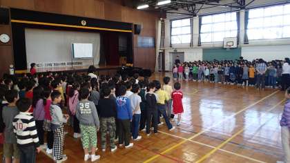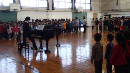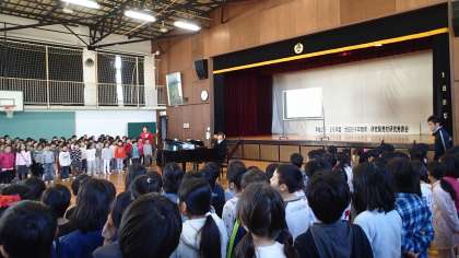 音楽朝会で、月の歌を歌った後に、校歌をみんなで合唱しました。普段は1番と3番しか歌いませんが、今回は4番まで全て練習しています。歌詞に込められた意味を考えながら美しいメロディーをしっかり覚えて欲しいと思います。