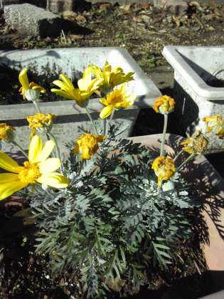 八幡ファームのユリオプスデージーが黄色い花を咲かせています。キク科の植物です。