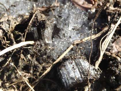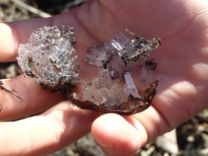 昔から子どもたちが興味を持つもののひとつに、霜柱があります。八幡ファームの田んぼのあとにはそれが沢山。見つけた子どもたちは、それを手に取ったり、踏んづけたり!