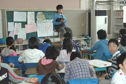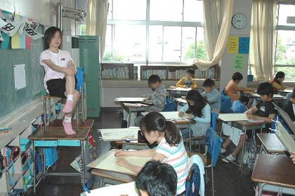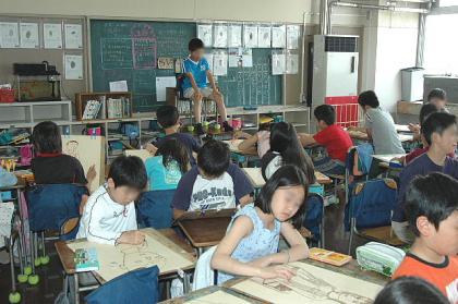 5月1日は全校写生会で、4〜6年生は教室で人物画に挑戦です。日常的に月一回の「クロッキータイム」があり、本校の児童にとって得意な分野です。各学級でモデルとなる子を4人選び、2人ずつ教室の前後の台の上でポーズをとります。いつものクロッキータイムでは10分程度で描きあげるのですが、今日はじっくりと時間をかけて下描きをします。モデルさんも手馴れたもの。しっかりとポーズをきめ、みんなが描きやすいようじっとしています。それに応えて、みんなも真剣にペンをはしらせていました。