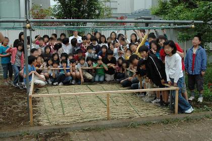 5月2日(金)昼すぎ、心配されていた天気もこの時間は曇りで、6年生が学校園に集まり、スギとヒノキの種をまきました。この日は教育委員会から教育改革担当部長さんをはじめとして3人の方もお見えになり、いつもお世話になっている「匠の会」の丸山さんにご指導いただきました。この写真は終了後みんなでそろって撮った記念写真です。