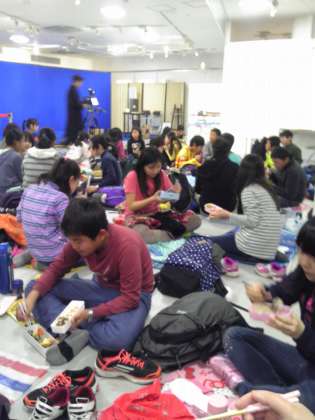 お昼はスタジオでシ−トを敷いてお弁当を食べていました。これから放送体験クラブにチャレンジします。